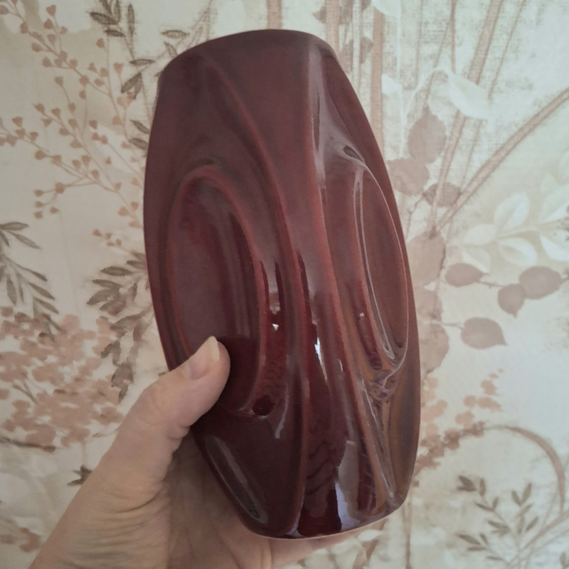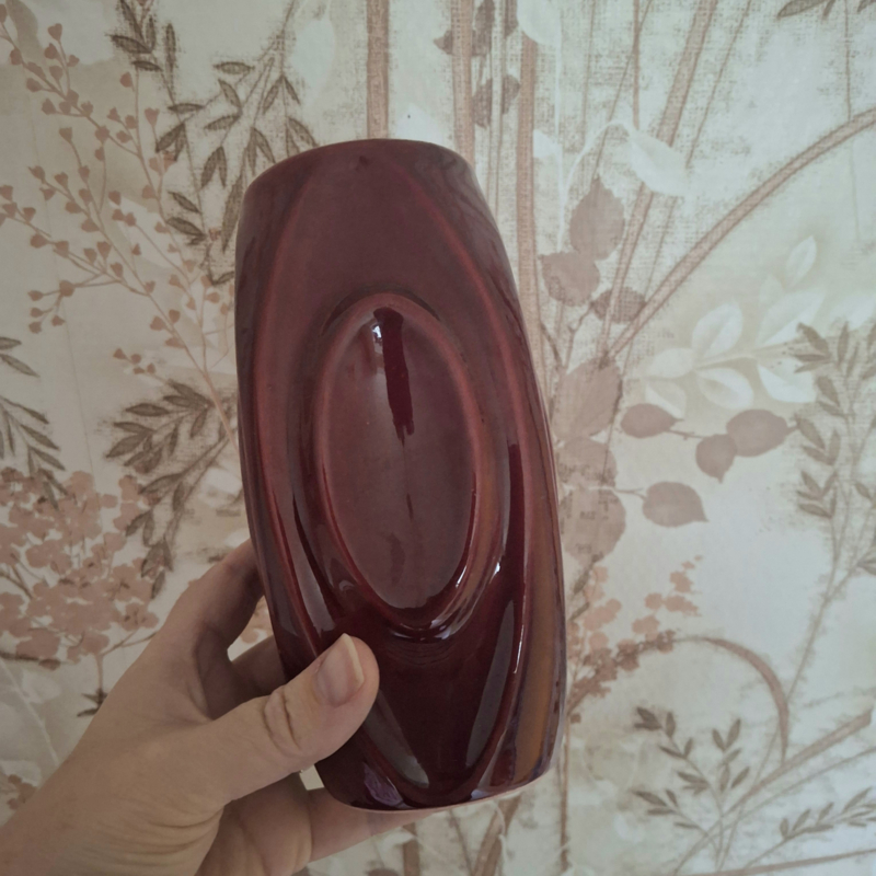Bordeauxrood vaasje met een hoogte van 18 cm. Geen merkje. Leuke vorm, vierkant met ovalen aan elke zijde. In perfecte staat. Helemaal de kleur van nu!