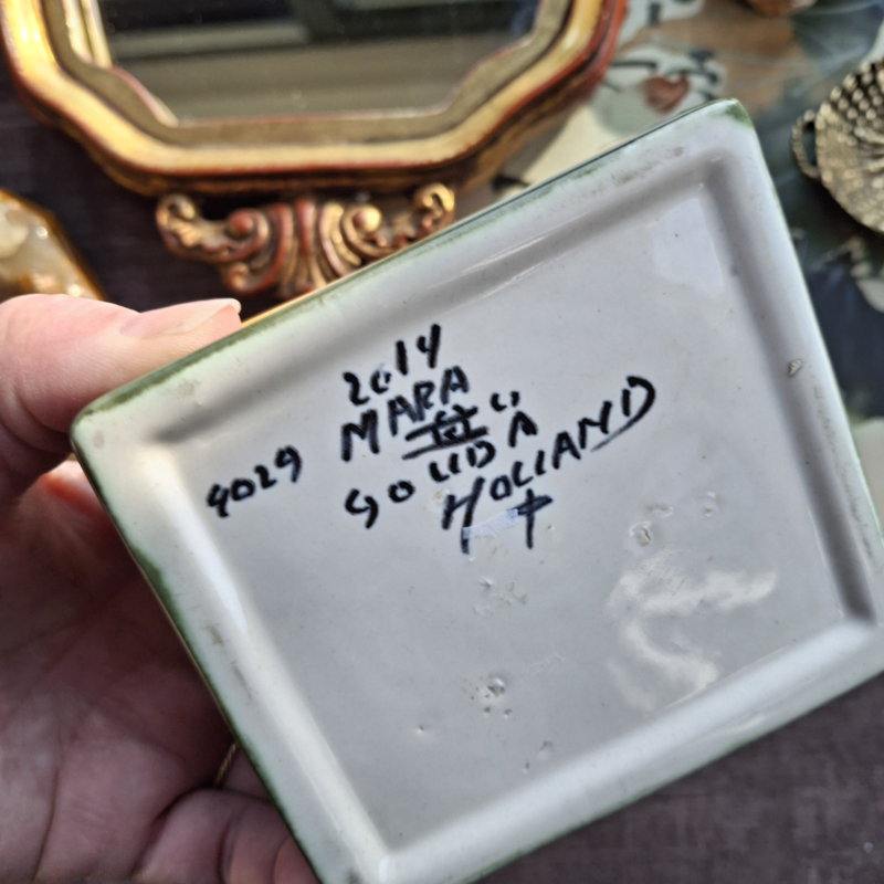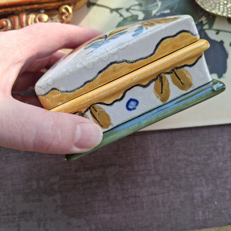 Mooi doosje van keramiek gemaakt door Gouda Holland in de serie Mara. In perfecte staat. Afmetingen: 9.5x8.5x5.5 cm. Kan als pakket verzonden worden.