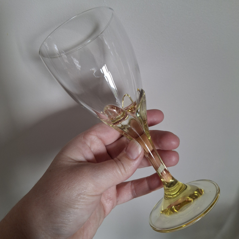 Mooie set van 4 wijnglazen met gele bloemachtige voet. Ze kunnen als pakket verzonden worden. De hoogte per glas is 17.5 cm.