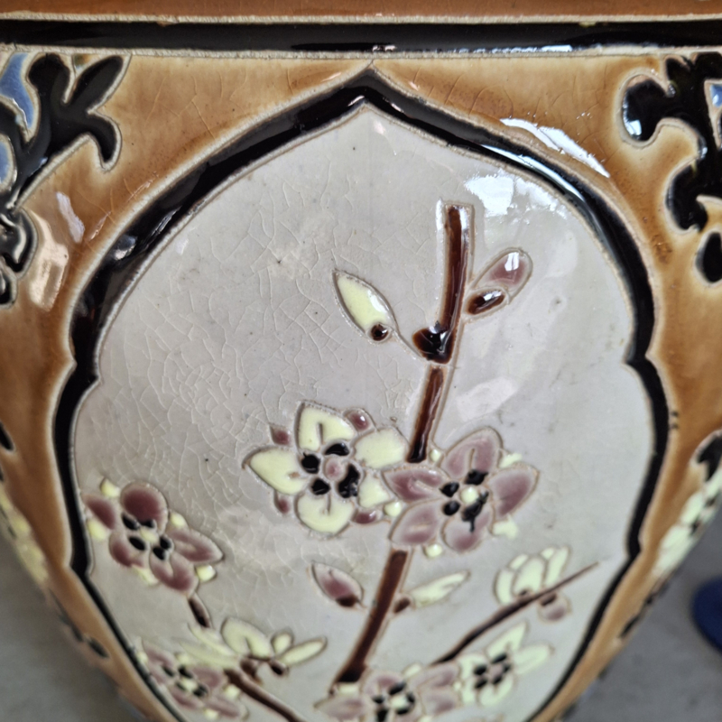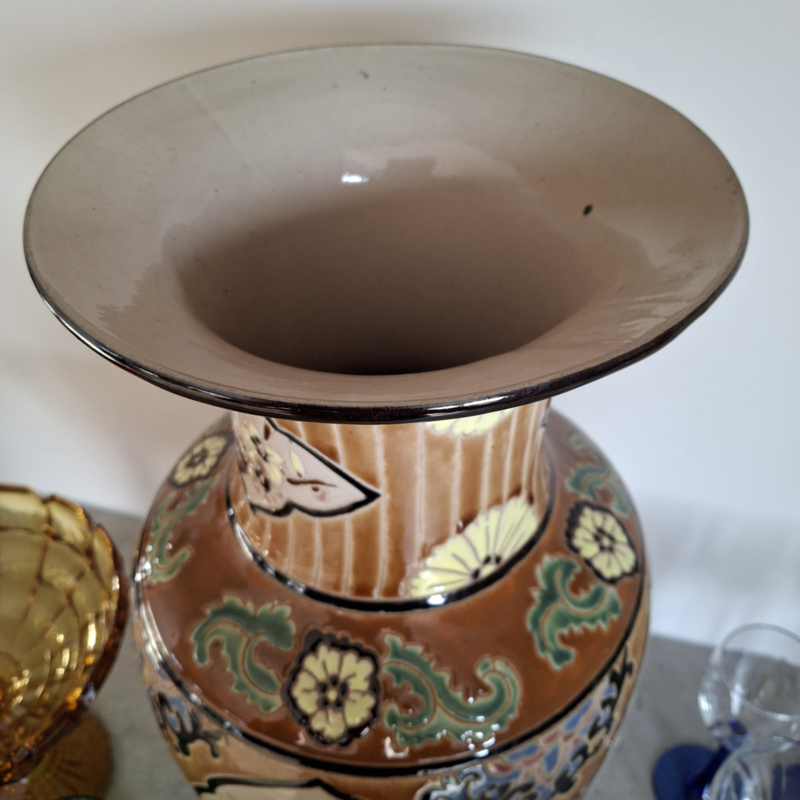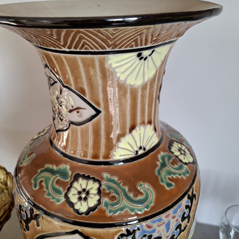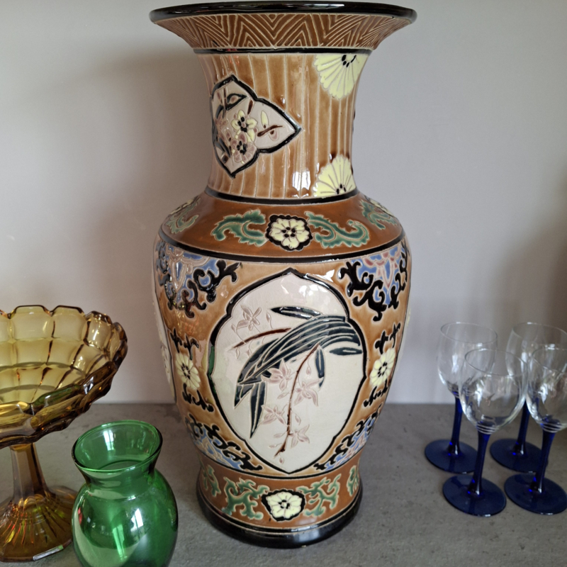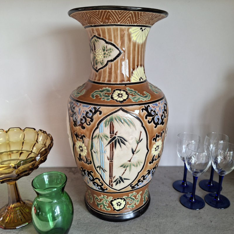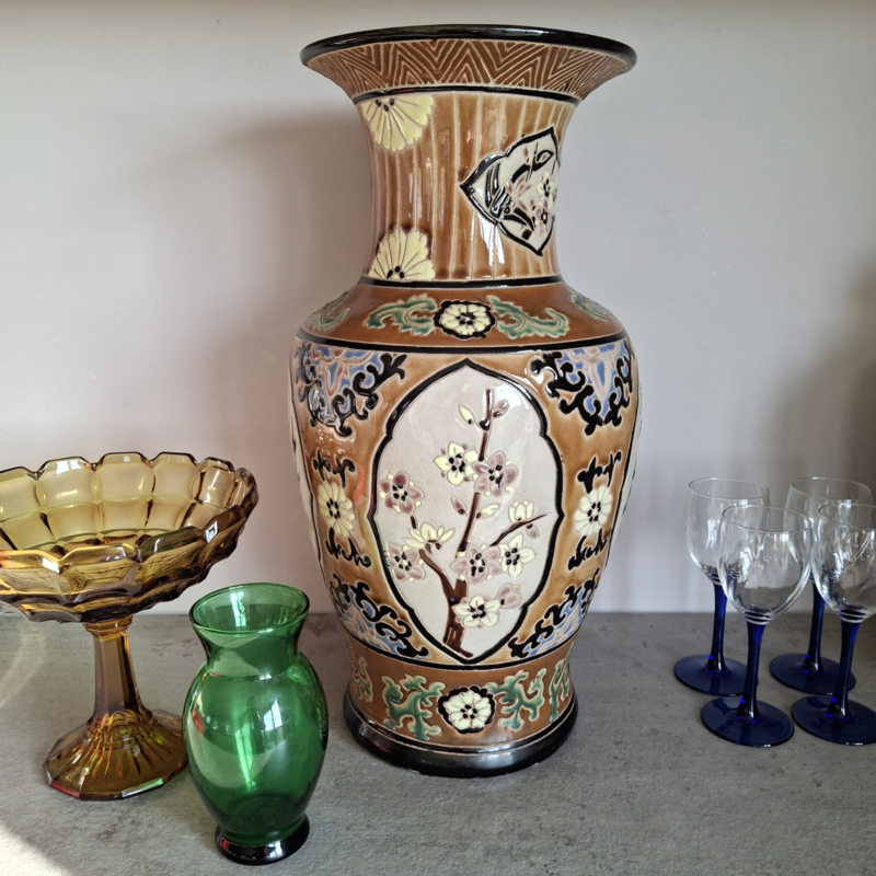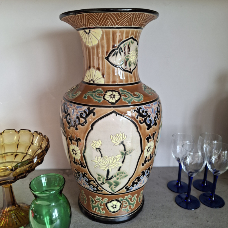 Grote oosterse vaas die nooit verveeld met 4 verschillende afbeeldingen (zie foto's) in mooie, zachte kleuren. De vaas heeft wat bijbehorend craquelé, maar is helemaal intact. De hoogte is 50 cm. De vaas kan verzonden worden op eigen risico. De voorkeur heeft bezorgen of afhalen gezien het formaat.