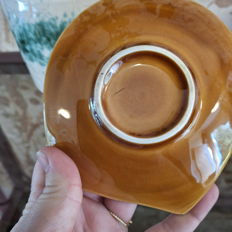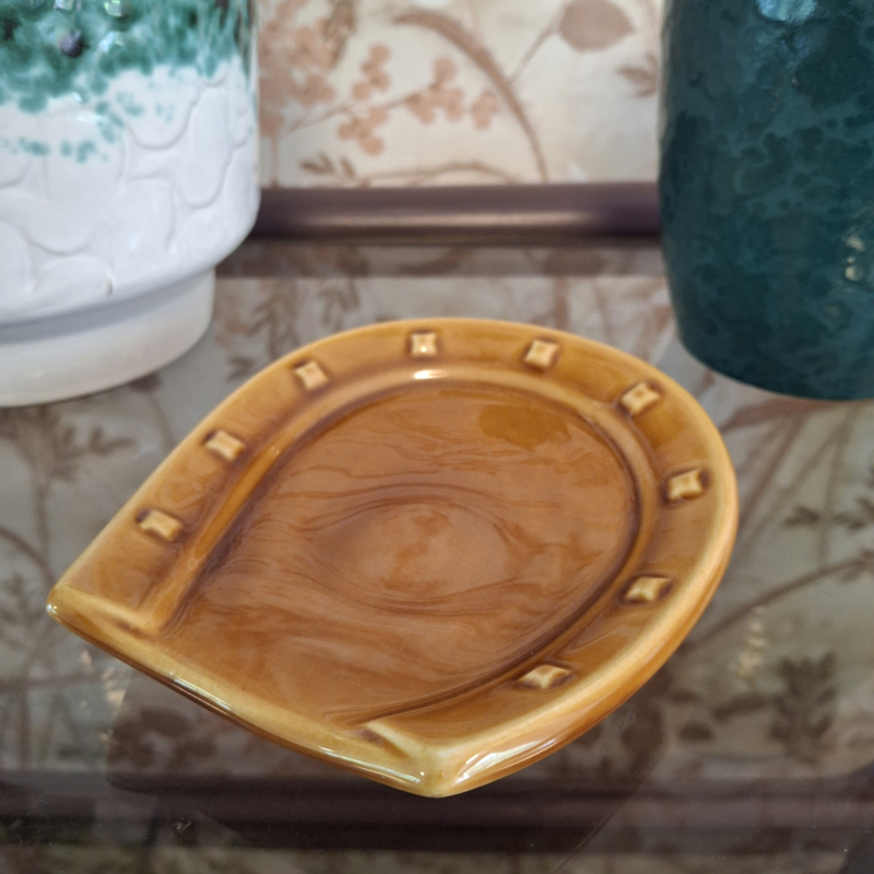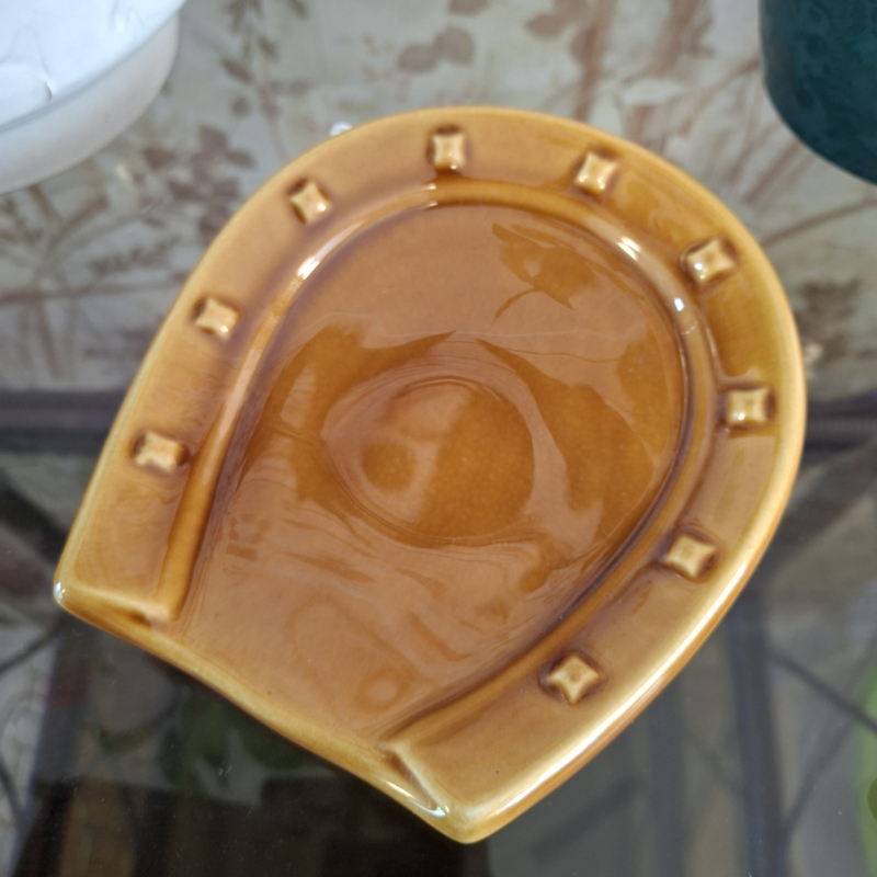 Schaaltje okerkleurig keramiek in de vorm van een hoefijzer. Afmetingen 13x12 cm. Kan as pakket verzonden worden.