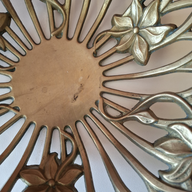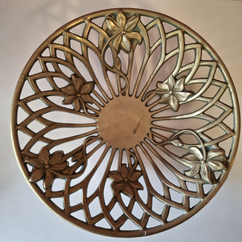 Mooie schaal van opengewerkt messing met bloemen. De doorsnede is 24 cm. In goede staat, een klein plekje in het midden. Kan verzonden worden als pakket.