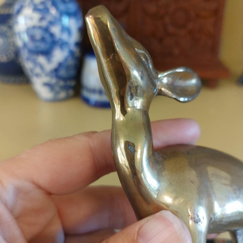 Sierlijk vormgegeven bambi van messing. Heeft wat kleine vlekjes. Zie foto. De maten zijn 12x12.5 cm.